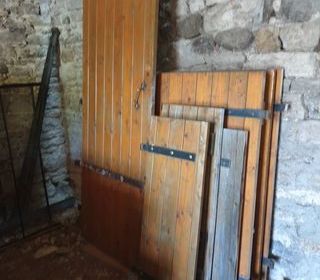 Lot de volets en bois, différents dimensions. Quatre paires et deux simples dont la porte. Équipées avec fermeture. Prix de l'ensemble 80 €.