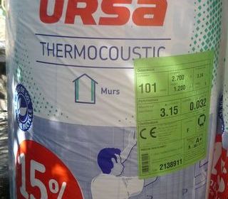 Rouleau de laine de verre semi rigide pour murs et combles PRK 32 revêtu Kraft URSA d'une surface de 2.079 m2 restant suite rénovation r=3.15 m2 K/W Dimensions : 2,70 M x 0.77
