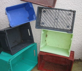 Lot de 7 caisses en plastique dont 1 caisse ajourée. Diverses tailles. Coloris vert clair, vert foncé, bordeau, bleu, noir, gris foncé. A prendre sur place. Petite cassure sur l'a