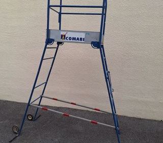 Escabeau roulant pliable . Dimensions :Plate-forme 90 x 50 , hauteur au sol 1.75 , garde -corps 1 m sur trois cotés avec deux sangles de sécurité a l'arrière , tablette porte ou