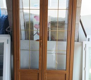 Porte à deux vantaux en Aluminium aspect bois. Matériel d'exposition quasi neuf. Dimensions ; 109cm de largeur sur une hauteur de 213cm Epaisseur ; 75 mm Feuillure périmétriqu
