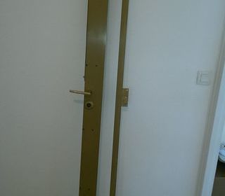 serrure sécurité LAPERCHE couleur bronze de l'extérieur on ouvre avec la clef à l'intérieur une poignée dorée se compose de 2 éléments un sur l'huisserie, l'autre sur la porte