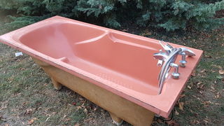 a vendre ; Baignoire à sabots en fibre de verre de couleur orange en très bon état avec son équipement robinet et vidange Dimensions ; long 170 cm larg 75 cm haut 60 cm