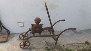Vends une pompe à vin très ancienne en fer avec roues en fer en l'état, pour décoration.