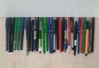 Stylos et feutres de différentes couleurs Stylos pointes fines Feutres pointes fines et épaisses Couleurs disponibles : bleu ? vert ? rouge ? noir PRIX 1 euro les 5 stylos (cou
