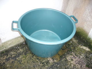 Vends BAQUET rond en Plastique - vert - diamètre à la base : 47cm hauteur : 36,54cm Diamètres en haut : int.: 56 ext.: 62 avec les poignées : 73cm.