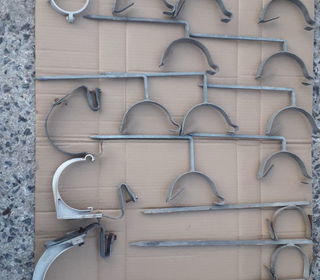 Vends supports/fixations á frapper en acier galvanisé pour gouttières : - 17 supports au total : 13 de 48 cm de longueur et 4 de 28 cm de longueur. + quelques colliers, étriers e
