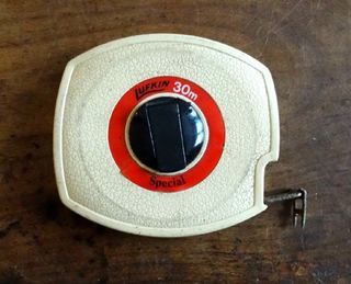 Particulier vend un ancien mètre à ruban métallique souple à enrouleur de marque "LUFKIN- Spécial" à manivelle de 30 m. Excellent état. Dimensions boitier: Longueur 11,5 cm x l