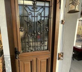 Porte d'entrée en bois de chêne couleur chêne marécageux Double vitrage + ornement + verre P4 anti-effraction + isolation phonique 46db Serrure 3 points + 3 bulles antivol + 4 char