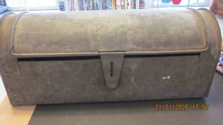 CAISSE DE PLOMBIER EN ZINC VINTAGE LONGUEUR 50 C M LARGEUR 20 C M PLUS DE SANGLE EN REMETTRE UNE AVEC DU MATERIEL A L'INTERIEUR COLLERS ROULEAU DE SCOTCH JOINTS COLLE E