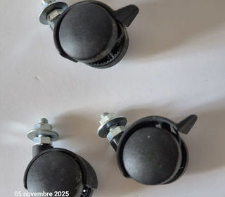 Lot de 4 roulettes dont 2 2 avec frein C'est bien un lot de 4 roulettes avec vis pour fixation Les roues font 4 cm, hauteur jusqu'au premier écrou 55 mm,