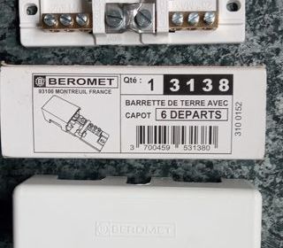 Barrette de terre avec capot de la marque Beromet, modèle 3138, pour 6 départs. L'article comprend la barrette, son capot et l'emballage d'origine.