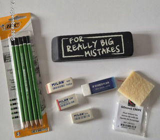 Lot de gommes techniques et set de 5 crayons graphites de dureté différentes Les dureté des 5 crayons sont 2B, B,HB, H et 2H Il y a 3 gommes blanch