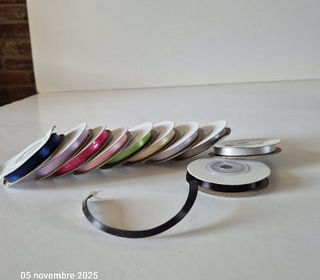 Lot de 10 bobines de ruban double satin, Dimensions : 8 mm x 9.50m soit un total de 95 mètres de ruban Composition : 100% Polyester Je peux changer les cou