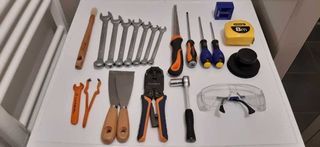 Lot d'outils composé de : -1 Pinceau de marque Dexter pro, 7 Clés plate/a à..."il de marque Magnusson numéros : 11,12,14,15,16,18,20. 1 Scie a manche placo platre de marque Magnuss
