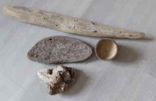 lot de 3 morceaux de bois flotté, un morceau de coque de noix de coco et un animal en bois