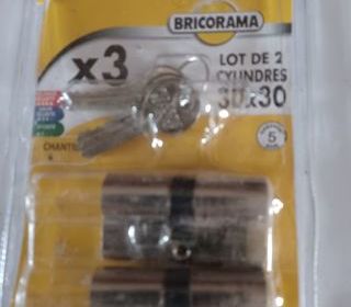 vend double cylindre de porte , neuf , de 30 x 30 mm , paire de cylindres de serrure de sécurité s entrouvrant , 3 clés de marque Bricorama , jamais utilisé , en laiton, identiques