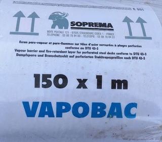 Bonjour, Cause déstockage Je vends des rouleaux de pare-vapeur / pare-flammes. Voile de verre aluminium Marque : SOPREMA VAPOBAC Dimensions des rouleaux : 150 x 1 m