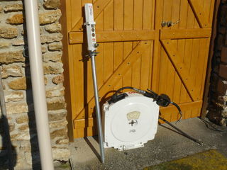 pompes SAMOA pour garagiste pour faire le plein d'huile après une vidange avec 10m de flexible, volucompteur ,enrouleur automatique,se fixe au mur et la pompe pneumatique dans un f