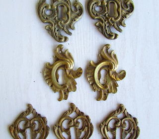 Deux paires et trois entrées de serrure en bronze, pour meubles anciens à restaurer, de style Louis XV, Louis XIV.Necessitant un lustrage pour faire apparaitre la dorure, couleur n