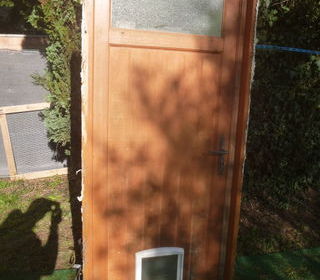 Porte de service en bois avec chatière Dimension cadre 87 X 205 Quatre points , seuil alu , serrure + clé A retirer sur Saint Amans Soult ( 81 - Tarn )
