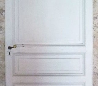 Porte intérieure blanche à panneaux antérieure à 1940 Dimensions de l'ouvrant 221X81,5, huisserie de 40mm (posée en applique sur un mur de refend) Sens : droite poussant. serr