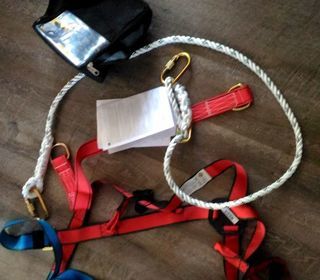 Je loue pour vos chantiers un équipement de sécurité neuf de marque top lock comprenant le harnais , une sangle de rappel et une corde nylon haute tenue de 2m ( 250 kg) équipée de