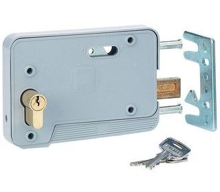 Serrure de sureté Couverture acier avec ceinture PVC, gâche plate acier, pêne bronze aluminium, condamnation et décondamnation intérieures par bouton, arrêt de portillon incorporé