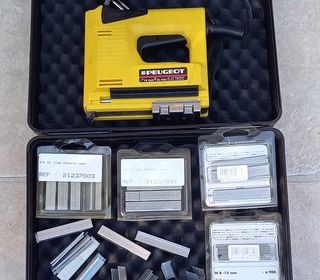 Agrafeuse électrique Peugeot de couleur jaune et noire, présentée dans une mallette noire contenant plusieurs boîtes de recharges d'agrafes de différentes tailles. Inclut un câble