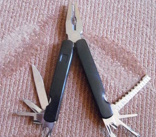Pince couteaux multifonctions Etat Neuf étui (jamais utilisé). 3 couteux, 2 ouvre-bouteilles, tournevis et 2 genres de clés. Stainless steel, China 10 cm fermé. 16 cm ouvert x 22