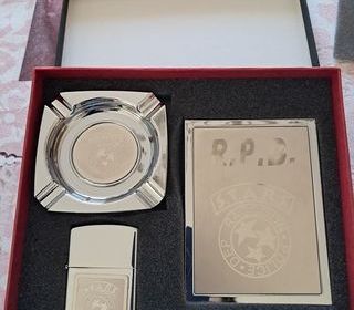 Bonjour, Je vous propose depuis ma collection "Resident Evil" un coffret pour fumeur composé : * Un cendrier 7x7x1cm, * Un briquet type Zippo 5x4x1cm * Porte-cigarette