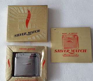 "Briquet SILVER MATCH compound années 60-70 pierre à changer Dans sa boîte d'origine avec notice Quasi neuf"