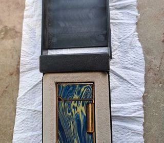 Ancien briquet de luxe Barini-Feuerzeug Insciption face avant - Barini Inscription face arrière - 18 K Gold Plated Couleur mélange bleu et doré Dans sa boite d'origine