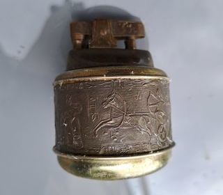 Très ancien briquet égyptien En laiton et fresque gravée sur une bande en cuivre tout le tour Hauteur 7 cm Diamètre 6 cm