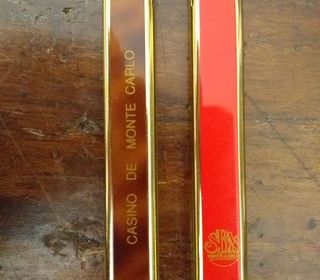 Deux briquets avec logos SBM Casino de Monte Carlo, années 1980, n'ayant pratiquement pas servi, longueur 9 ctms, couleurs rouge et marron jaspé. Faire offre pour un ou deux objet