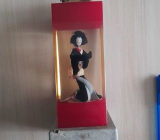 Briquet de table représentation Geisha 3 D hauteur 19 cm Briquet de table représentant 3 D Geisha à l'intérieur. Il s'illumine ou petite musique, sauf que la partie pile est bie
