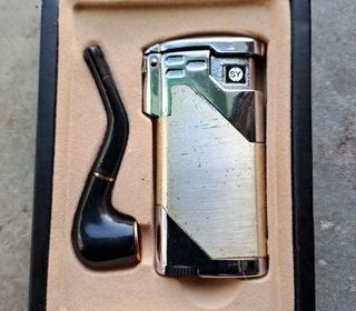 Ancien briquet tempête Sanyang Rafined series Lighter Face avant doré Face arrière chromée Avec une pipe miniature dans sa boite d'origine Fonctionne parfaitement bien Quelq
