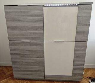 BAS 3 portes , 1 tiroir AU CENTRE fond une glace HAUT 3 portes dont 1 qui fait vitrine BAS 153*110*38 haut 153*055 haut pieds 0.30 total larg/153 haut/195 prof/53