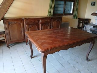 buffet : longueur :2,30 mètres Hauteur :95 cm profondeur: 55 cm table à manger : 1,40 mètres sans les rallonges. 2 rallonges de 50 cm chacune. ouverture totale :2,40 mètres