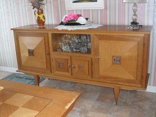 salle a manger chene clair dessus decor damier anne 1960 Buffetstyle enfilade 2 portes et vitrine parfait etat L200 l 090 H 100 Table dessus decor damier 2 rallonges de 0.45 peti