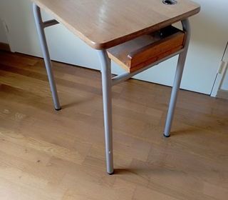 Ces petits pupitres au piétement tubulaire ont vu défiler les bambins quelques décennies durant, et cela ne les rend que plus attachants encore. Abricot, moutarde, bleu nuit ou ble