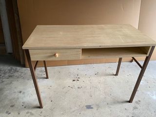 bureau en aggloméré imitation chêne clair. bon état. pieds en fer couleur marron.1 tiroir. livrable sur La Rochelle, Rochefort, Royan Dimensions : L : 100 ; P : 50 ; H : 72