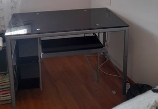 Bureau plateau en verre noir mesurant 1M15 de long et 60 cm de large avec deux étagères en verre noir et tablette coulissante . Très bon état.