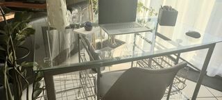 Vends bureau plateau en verre et ossature de couleur grise bon état. Plateau pour poser ordinateur et tablette pour mettre des casiers