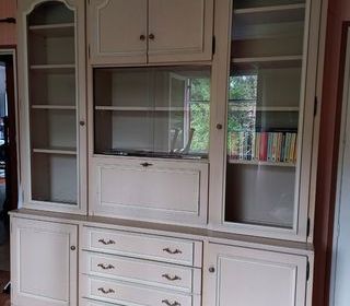 Vend Bibliothèque beige blanc vitrée Dimensions: Haut 2.49 m, 50.78m et 1.71m) Largeur: 2.15 m; Profondeur 0.45 m et 0.31 m. Bon état Bas: 2 portes avec étagère, 4 tiroirs H