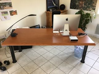 Bureau bois massif 220 x 105 Bel état Passages câbles à l'intérieur des pieds et dans le tube sous le bureau