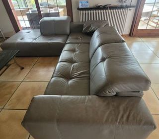 Canapé d'angle en cuir grainé coloris gris/taupe de chez Natuzzi en trois parties qui se clipsent pour former un ensemble (peuvent se désolidariser pour un transport plus facile),