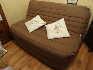 canapé clic-clac deux places. Revêtement tissu couleur marron avec poches latérales. Bon état