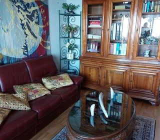 Canapé en état convenable. Quelques marques d'usure du cuir. 2 légers défauts à l'arrière. Coin sans dossier grignoté par notre lapin; ce coin peut être collé à un mur.