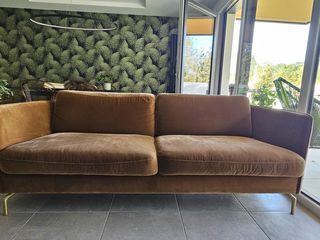 Canapé 3 places modèle Osaka en parfait état Hauteur :77 Longueur : 203 Profondeur: 87,5 Tissu de couleur camel Pieds en laiton brossé